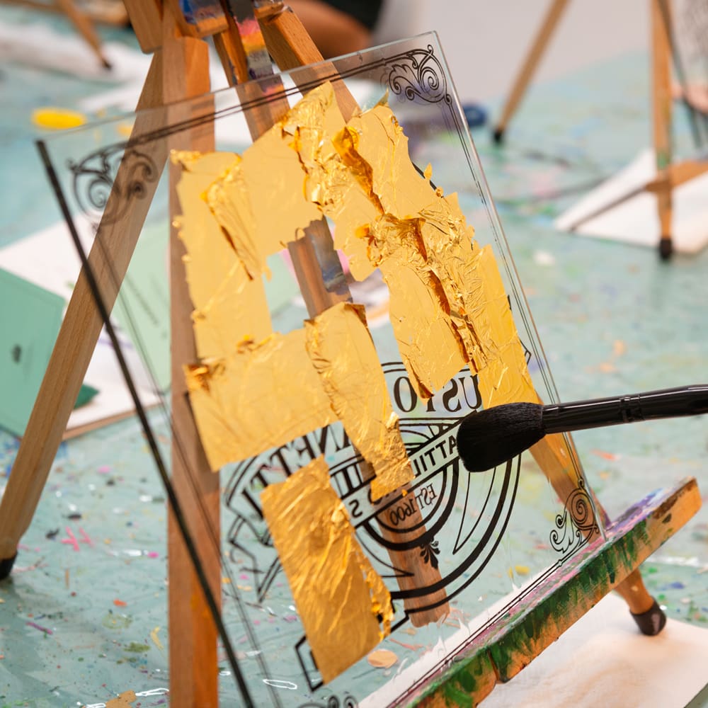 At Giusto Manetti Battiloro, we provide all the tools needed for gilding on glass, including alcohol-based size to be applied with the Ghirlandaio brush and the new entry gelatine sheets, i.e., adhesives suitable for water gilding on glass.