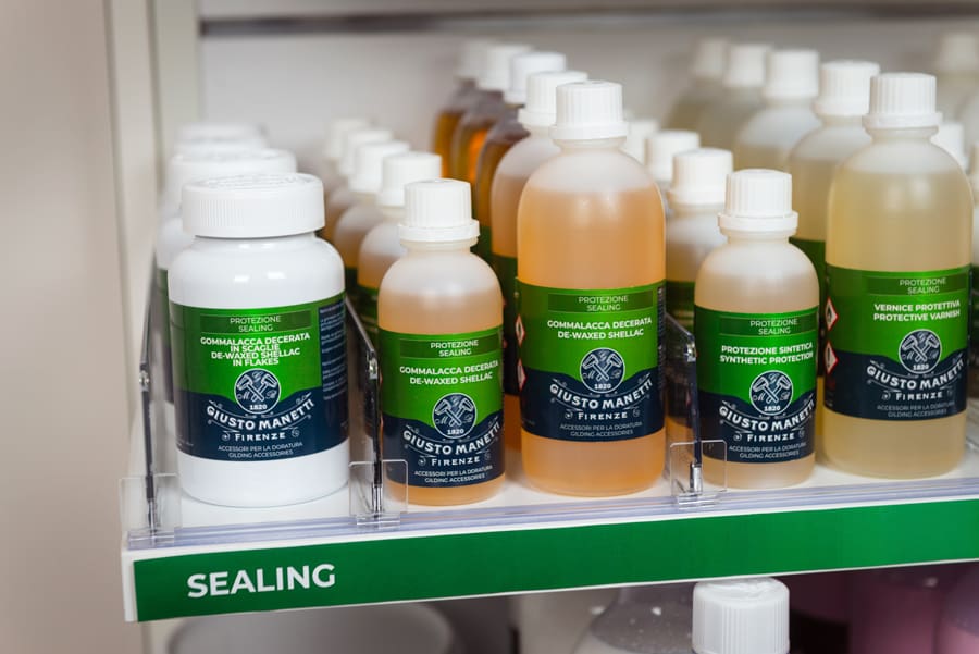A questo proposito, abbiamo voluto differenziare ogni categoria di prodotto non solo per la posizione che occupa all’interno dell’espositore, ma anche con il colore: abbiamo creato delle pratiche etichette adesive da applicare a ogni scaffale, diverse per tonalità. In questo modo ogni colore indica una categoria di prodotto: l’azzurro, per esempio, accompagna gli articoli per la doratura a guazzo, il verde indica le protezioni, mentre il grigio raccoglie tutti gli strumenti.